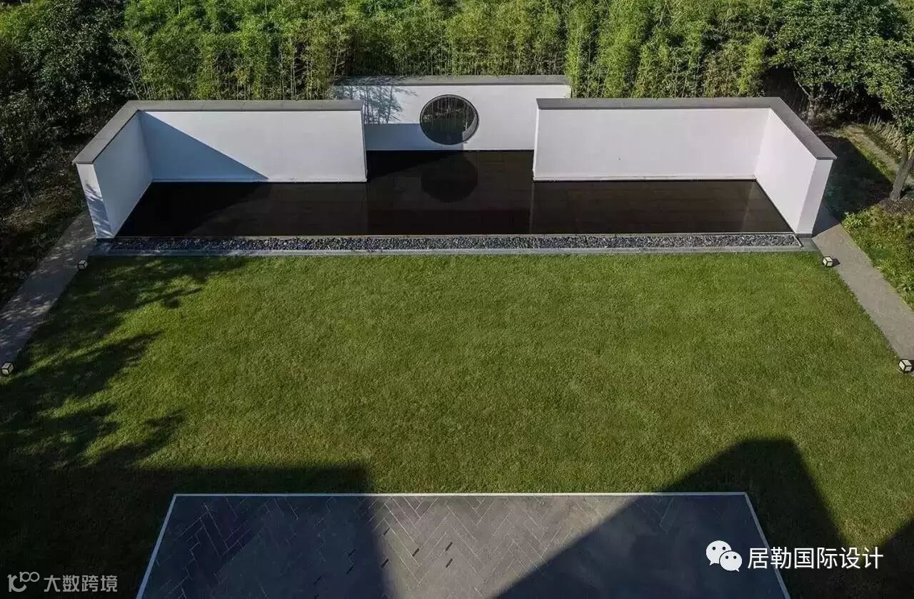 这套别墅位于苏州金鸡湖畔,地上三层、地下一层且前后各有花园。花园与客厅对应的一端设有景观墙,借鉴了苏州园林“粉墙黛瓦”的特征。一池浅水,恰好映出白墙与竹影;墙后隐藏着一条竹林小径,大有“曲径通幽处,禅房花木深”的意境。