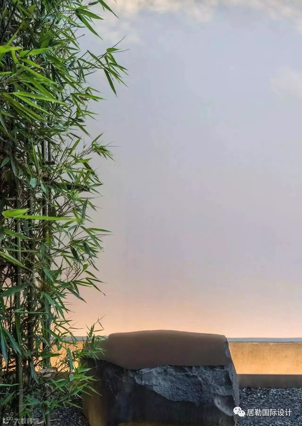 庭院的一端被一簇紫竹所占据,竹丛上方还巧妙的安放了投射灯,灯光下竹子的剪影映射在白色墙上如一幅“墨竹”,微风吹动更是撩人。墙边疏密有致地摆放着三块深色花岗岩,在粉墙的映衬下轮廓也分外俊朗。