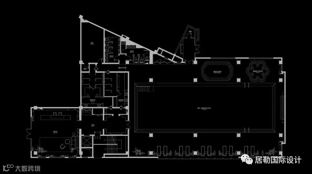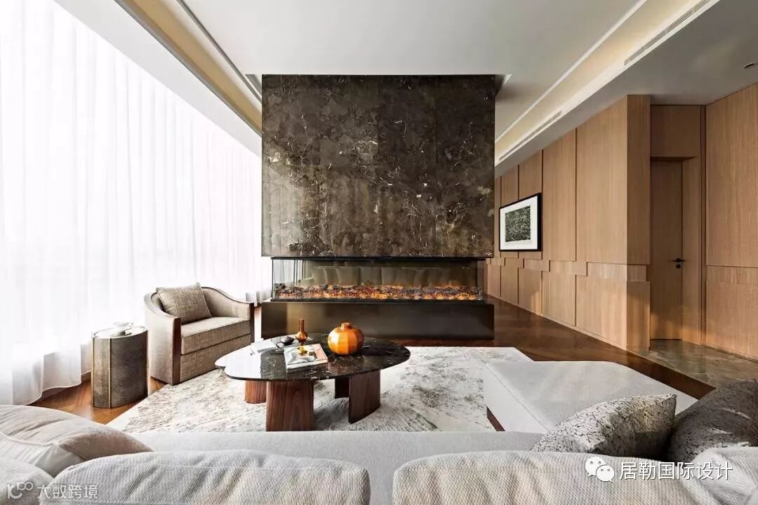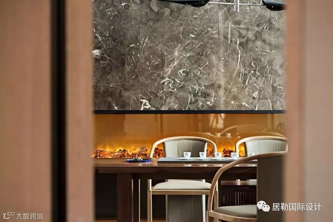 ② 隔断在处理空间区域分隔上的使用:围绕壁炉中轴主线串起了就餐区、休闲接待区、茶室等不同功能区域,有效地划分出空间的层次和形成两个不同功能区域的视觉中心落眼点。