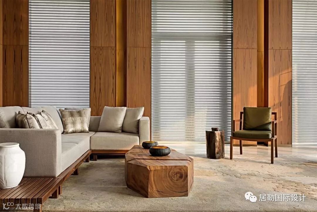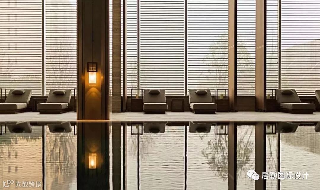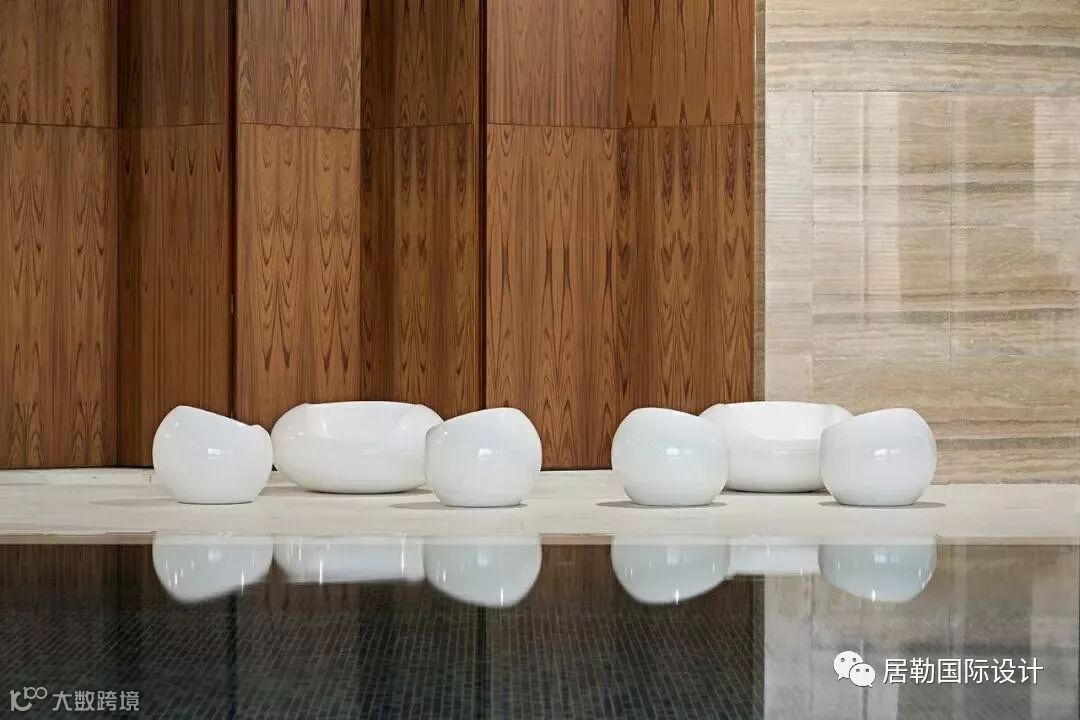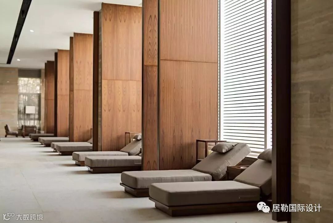 柚木色暖,木质密度高,营造休闲气息使用再合适不过,配合着温润哑光面的贝金米黄大理石材,较好地显示出舒适轻松的温暖基调,墙面辅之天然海浪般纹理的意大利银灰洞石,块面地呈现了一个简约而惬意放松的室内泳池空间。