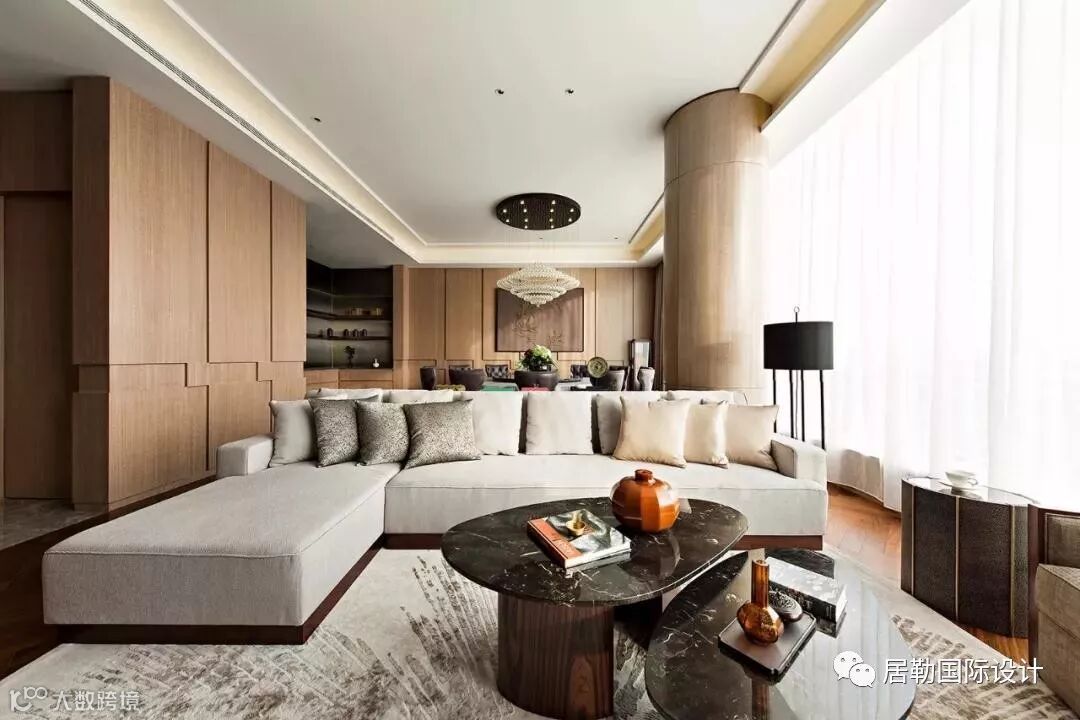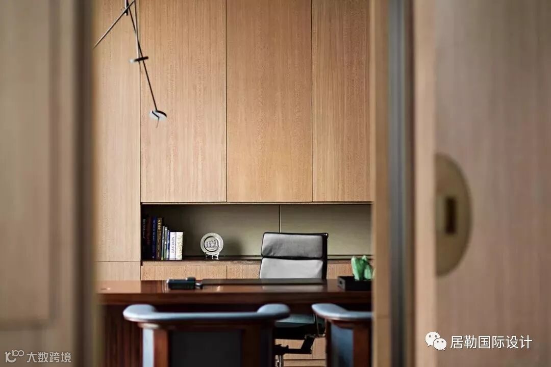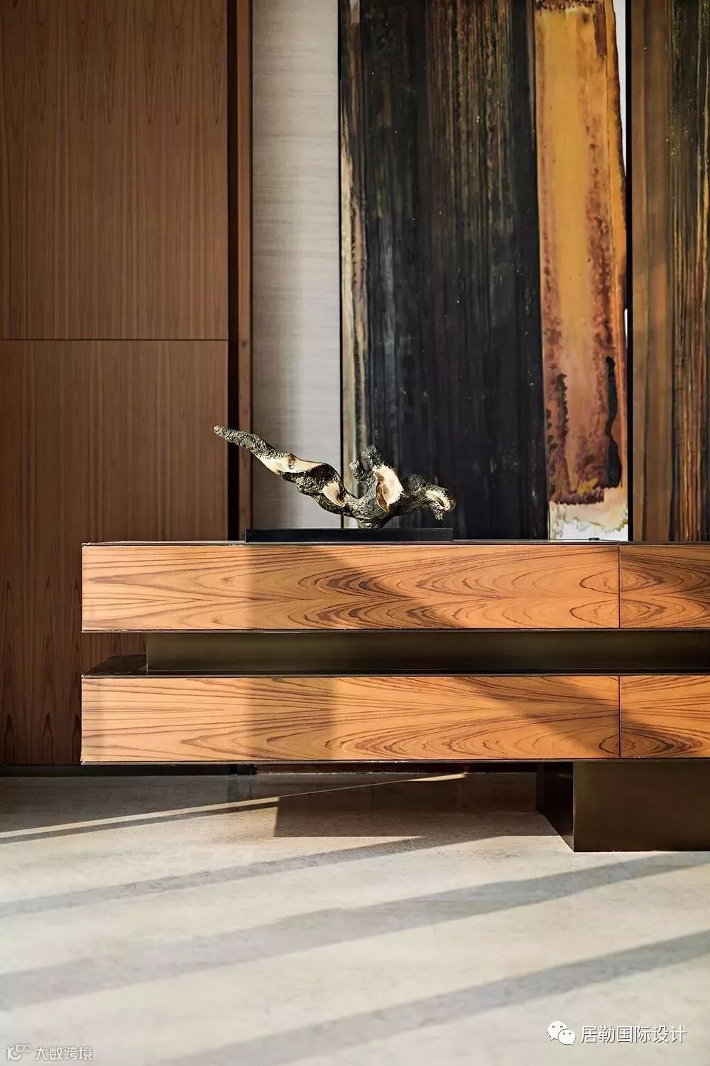 ① 材料在空间气质品质的上呈现,使用了温暖而不失华丽的哑光珍珠木装饰面,天然柚木实木地板,天然大理石,拉丝金属等材料糅合呈现出的现代空间气质。