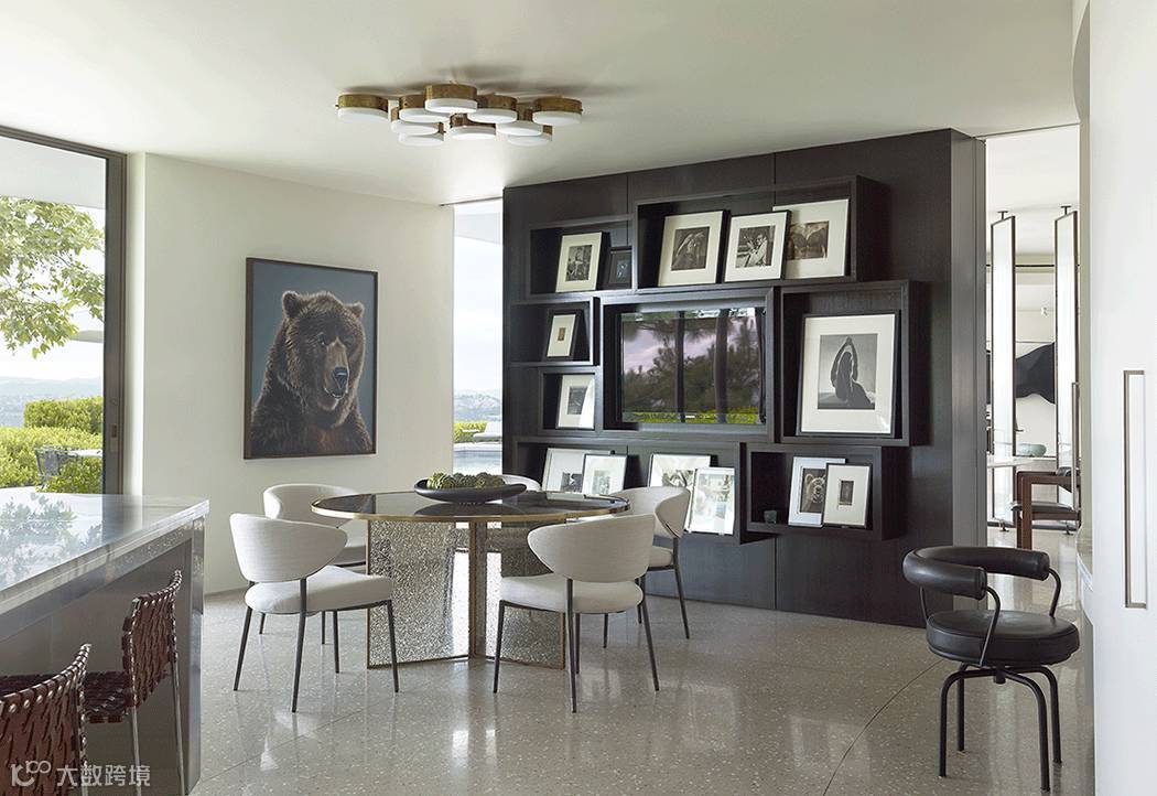 餐厅另外一侧的墙面用黑色木饰面
