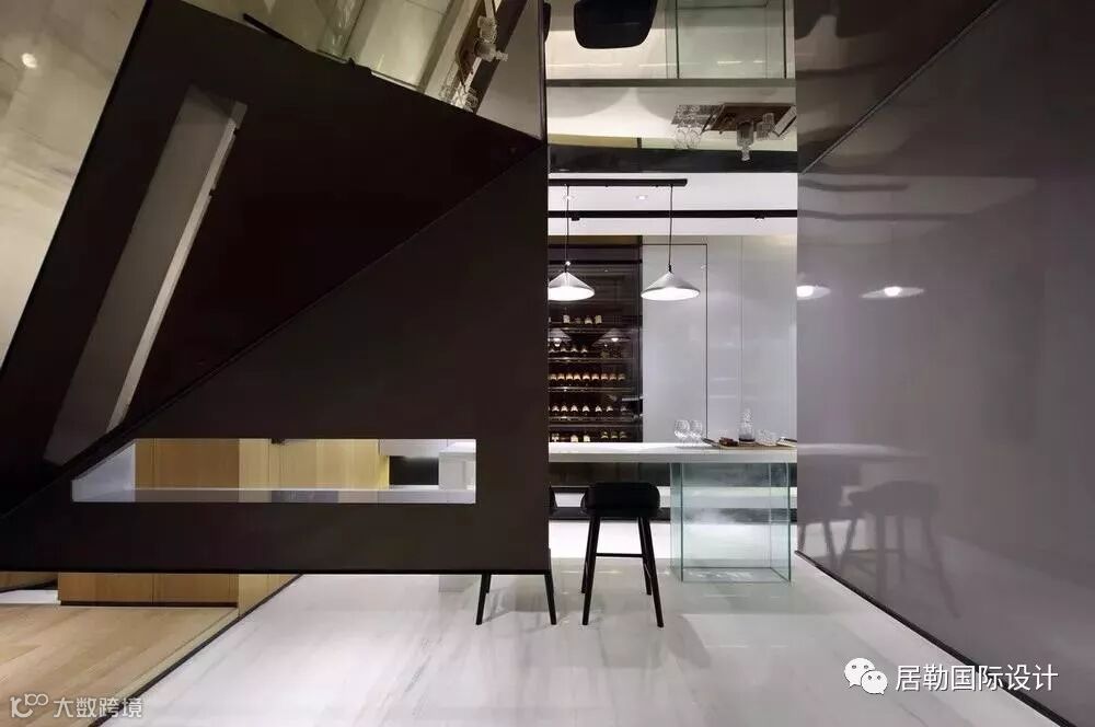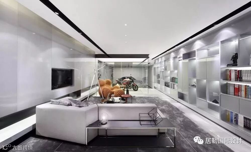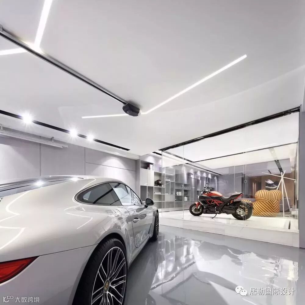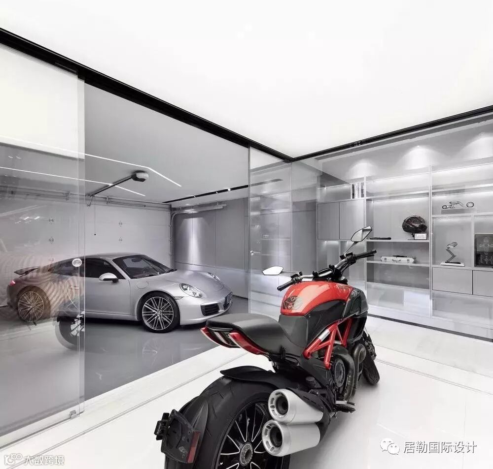 设计师在设计的过程中,首先对建筑的原始结构做一些小小的改动:一楼的客厅外扩了一部分;三层的大露台截取一部分做了一个阳光房;负一层与车库打通,将原建筑的工人房拆除,将之移至负一层最靠里的翼侧,形成一个带天窗的多功能房,而将整合后的部分,以如琥珀一般将一辆红色的Ducati“大鬼”包进大玻璃罩为视觉和空间氛围的重点,改造成一个带有娱乐性质的玩赏空间。