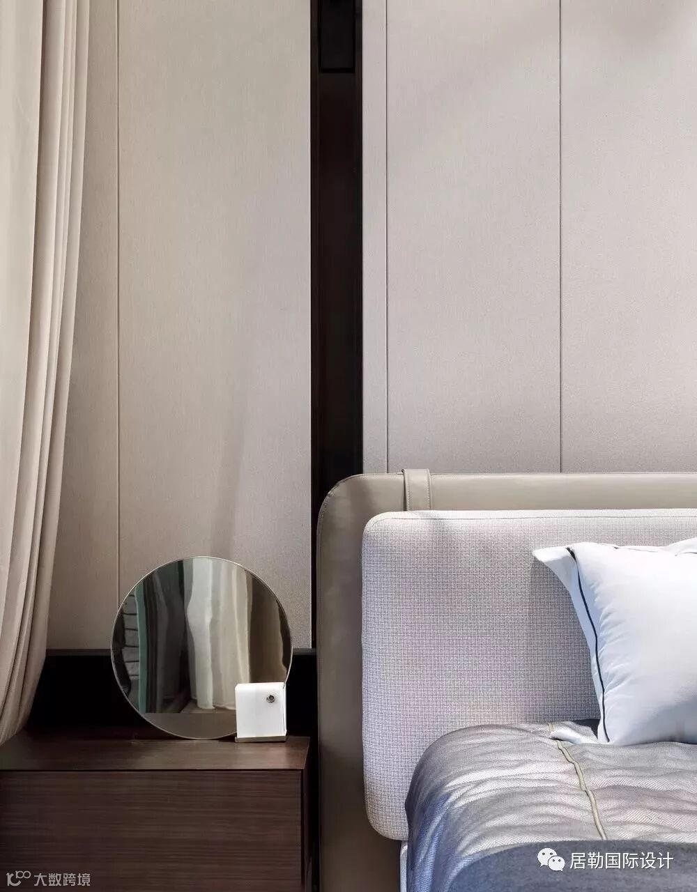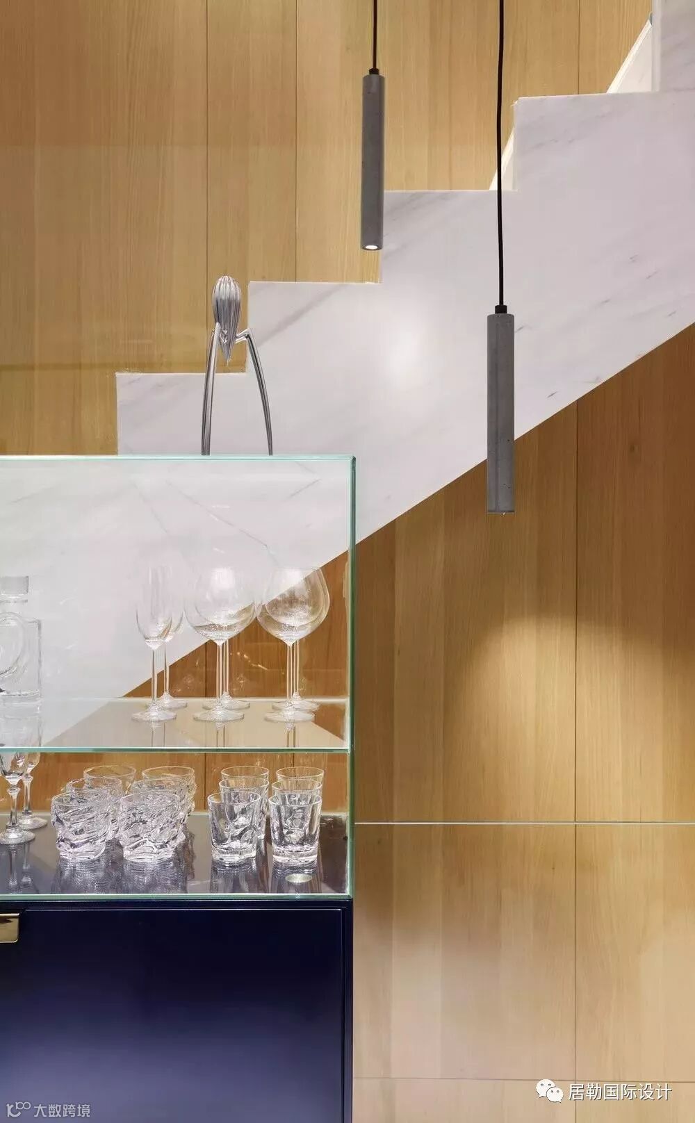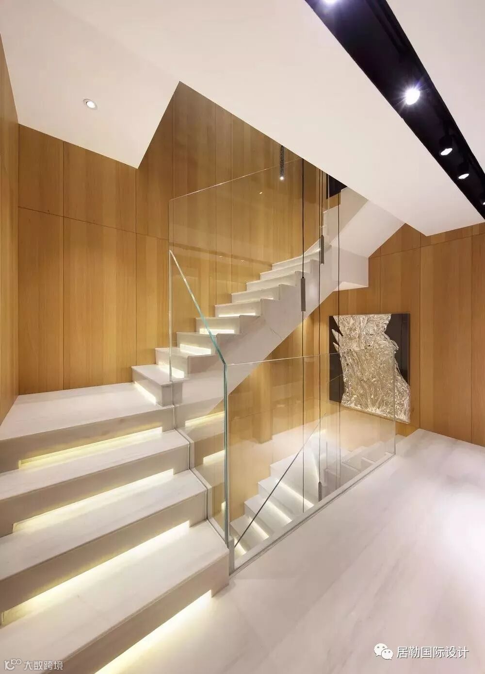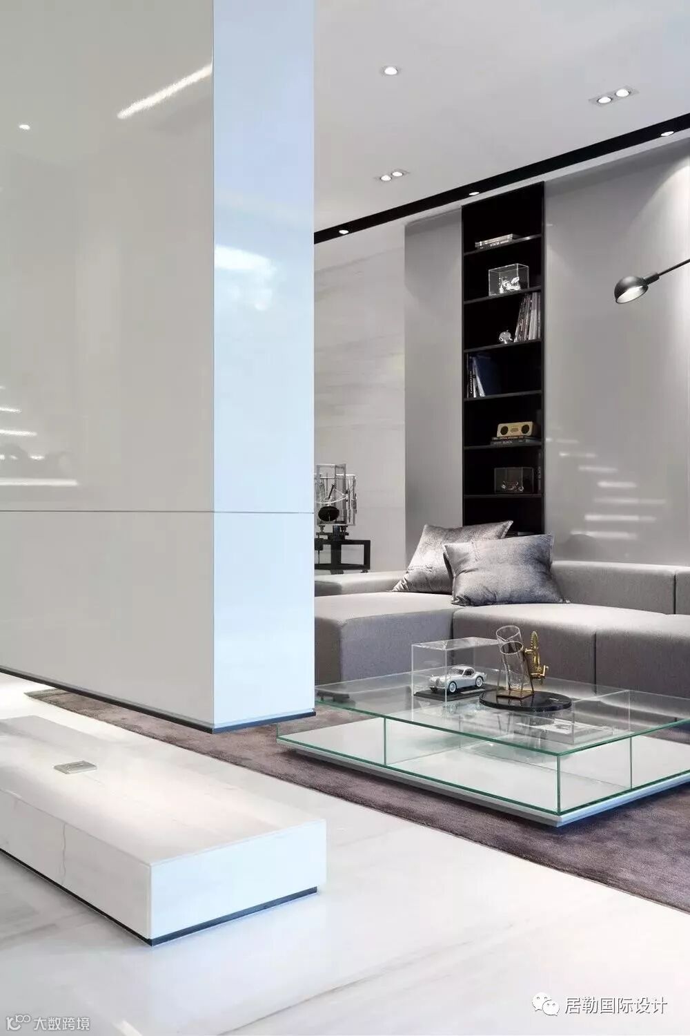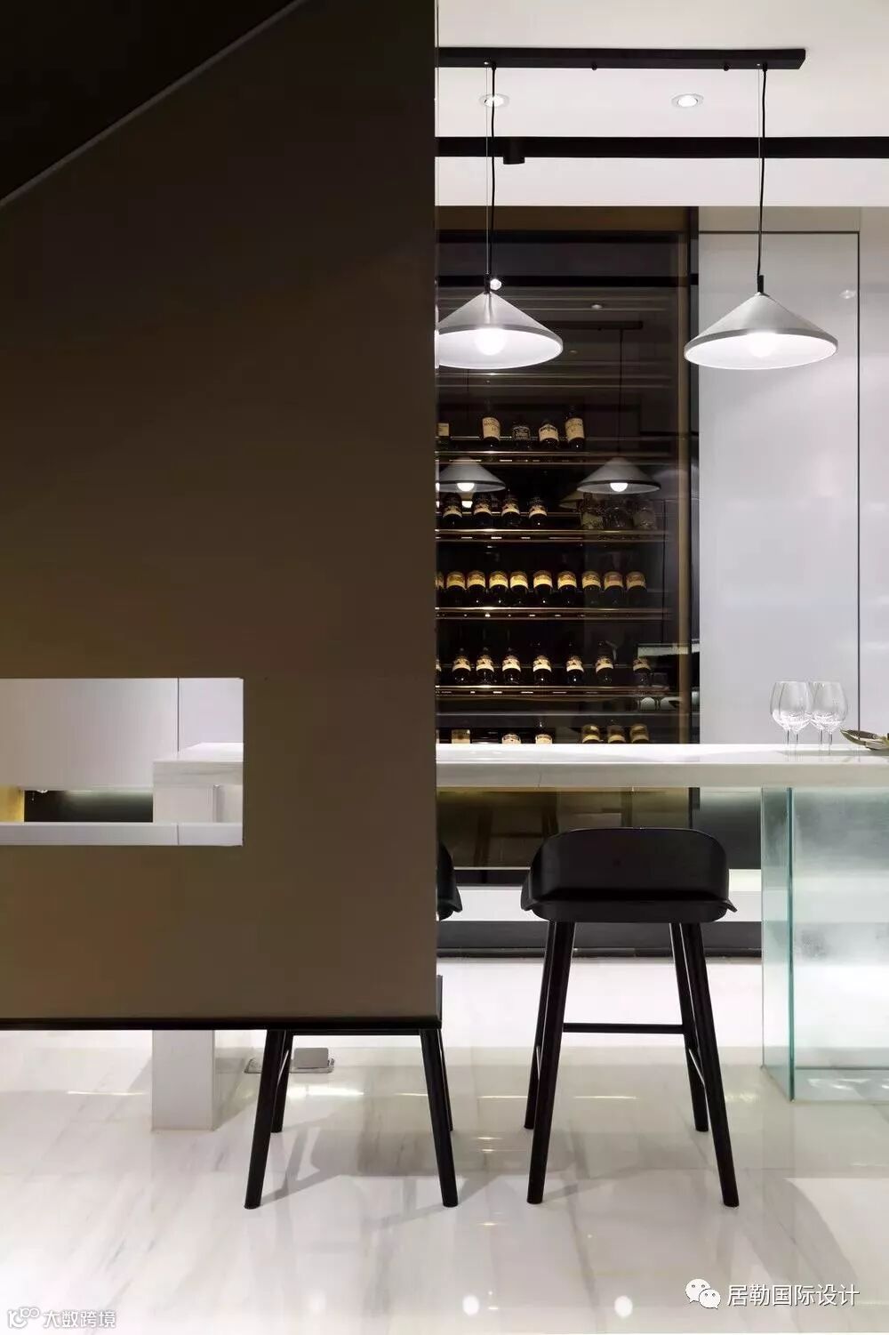 一方面通过使用灯光和材质的变化营造同一色系和不同色系的微妙变化,另一方面通过相应的线条将立面和天花作不对称切割,将灯具作为能够活泼空间关系的点和线融入到空间当中,赋予空间活泼的趣味。