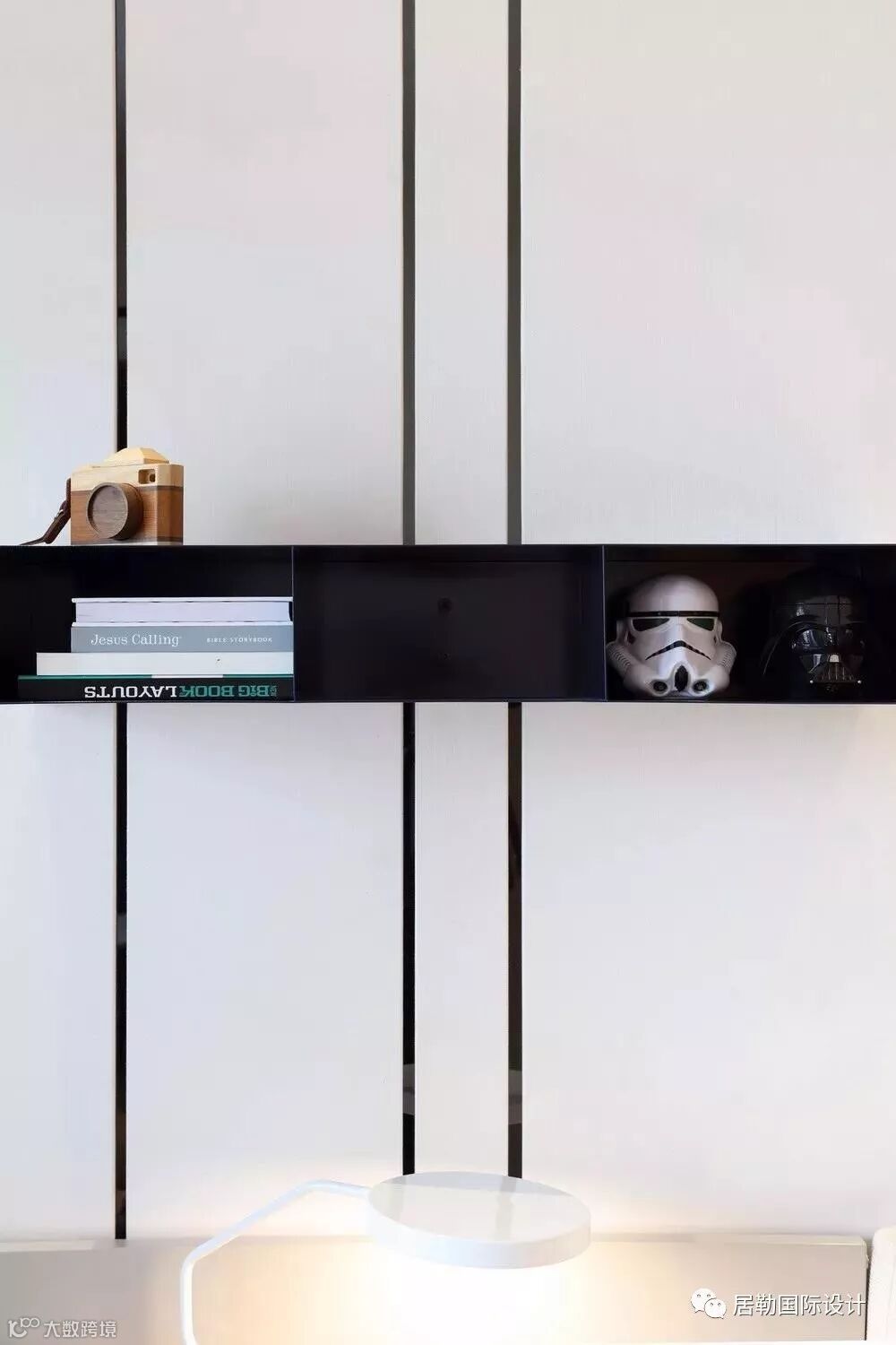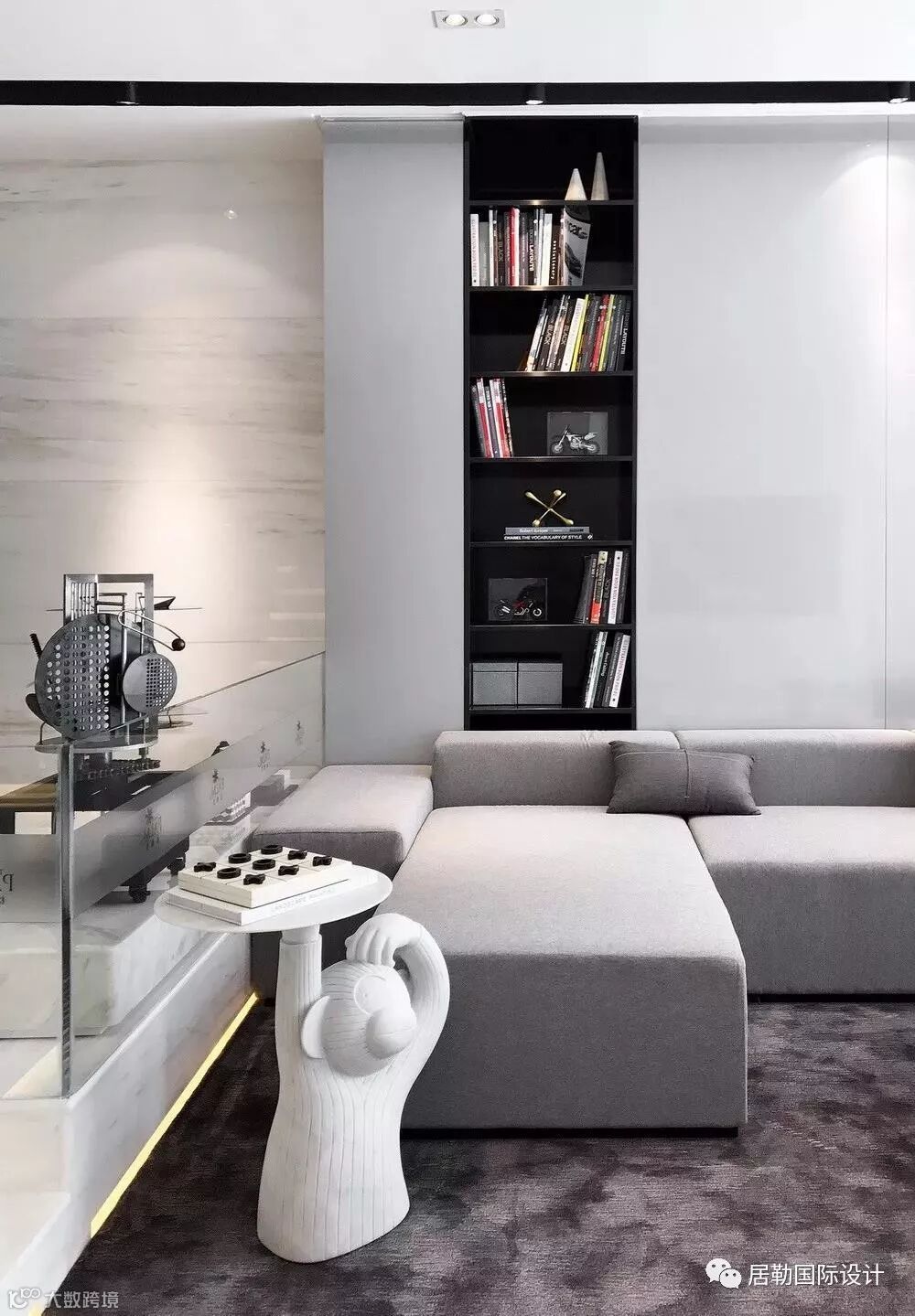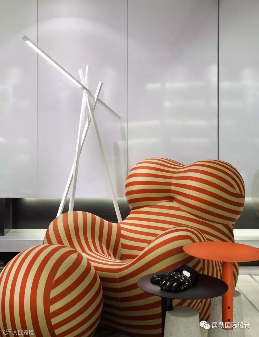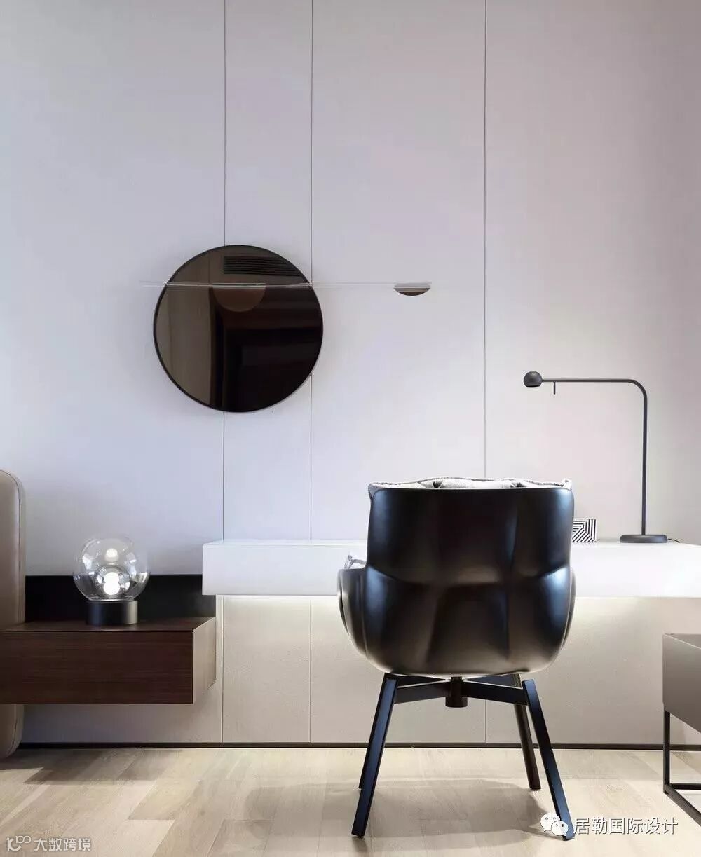 然后再放一个3D打印的美式机车模型——那意味着年轻人不可捉摸的小小的贪心。还需要些代表所谓时尚的东西做些铺垫,于是在墙上有了一个Nomon的挂钟,B&B的女人躯体躺椅,都是“牌子”,当然,还要那么一两个现代艺术雕塑。
