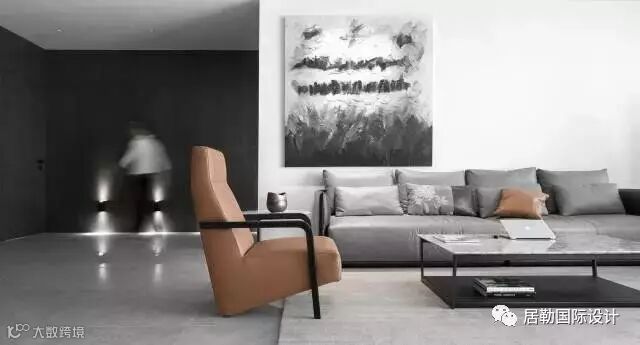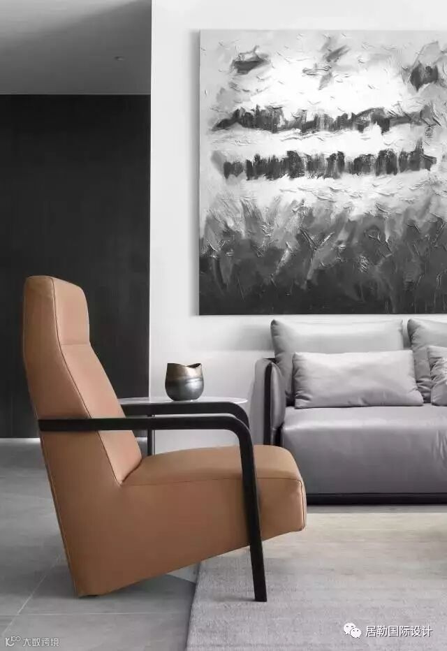 整体以经典的黑白灰三色为主,利用颜色的明暗配比来营造丰富的层次。单人皮质沙发和抱枕使用优雅复古的大地黄,为这个冰冷的灰盒子注入一丝温度。