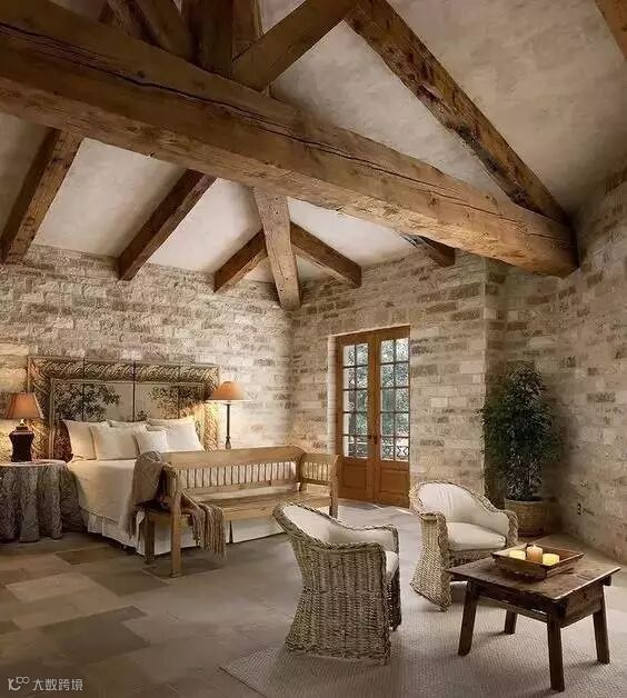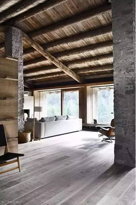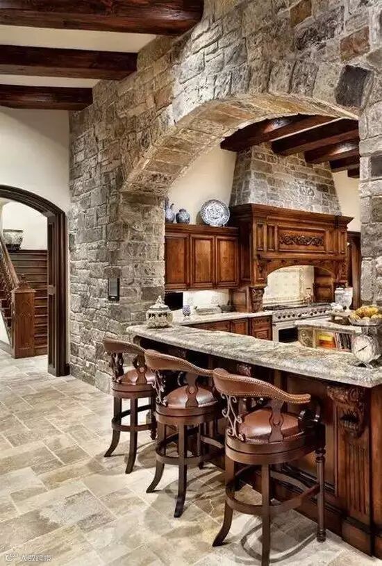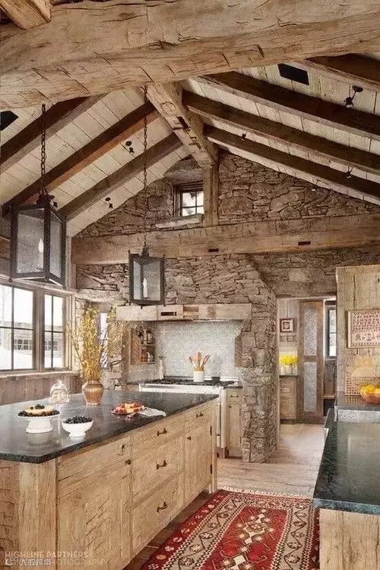 毛石一般裸露在外墙,尤其以美式乡村风格为主。将毛石的粗糙质感与质朴温和的原木加以搭配,能达到一种和谐自然的建筑效果。在设计师的手中,他们总能对两者加以精确地把握,从而营造出一种自然放松的氛围。