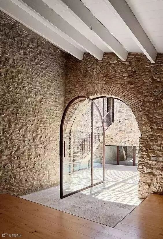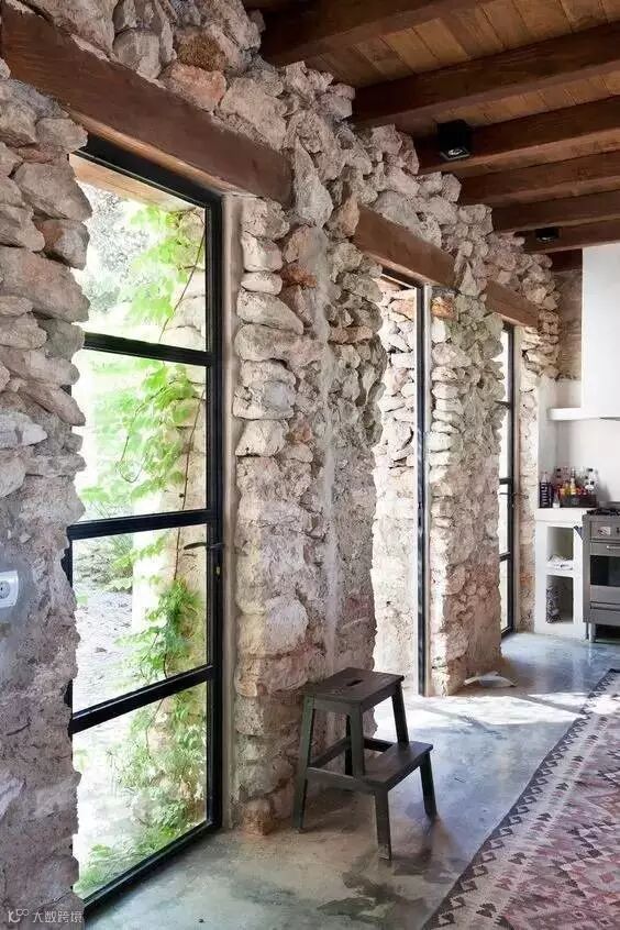 毛石是天然或从石矿里刚开采出来未经加工的,也称“乱石”。它的用途很多,砌筑基础、勒脚、墙身、堤坝等,在室外墙体中随处可见。但当它被混凝土包裹之后,我们确实很难见到它的真身。而现在,毛石这种特殊的建筑材料又卷土重来啦!今天我们要分享的是一组室内的毛石墙体,看看它会给我们带来什么样的视觉观感呢?