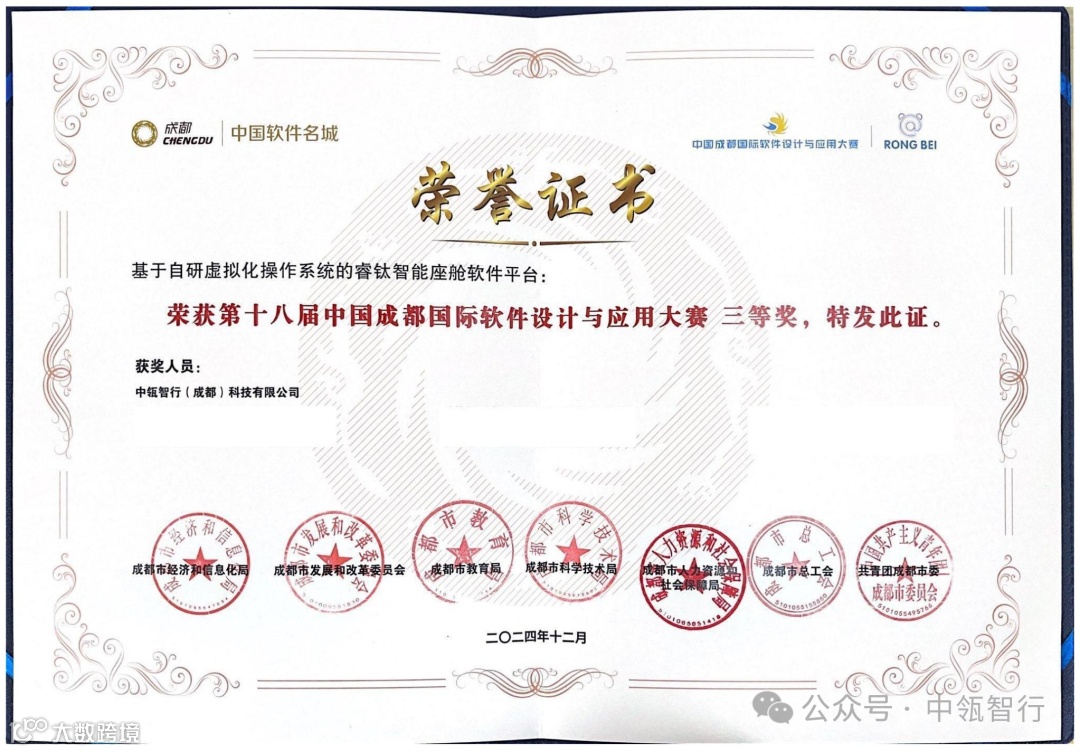本次大会还颁发了“中国成都国际软件设计与应用大赛”相关奖项,中瓴智行自主创新的“基于自研虚拟化操作系统的睿钛智能座舱软件平台”在经过多轮激烈竞赛后,荣获“第十八届中国成都国际软件设计与应用大赛三等奖”。