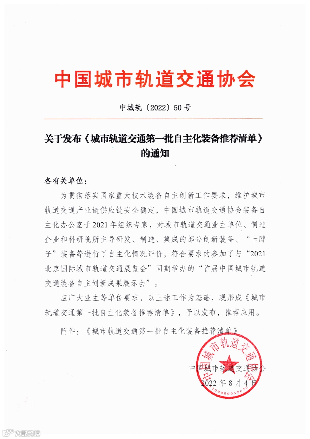 导读:应广大业主等单位要求,以上述工作为基础,现形成《城市轨道交通第一批自主化装备推荐清单》,予以发布,推荐应用。