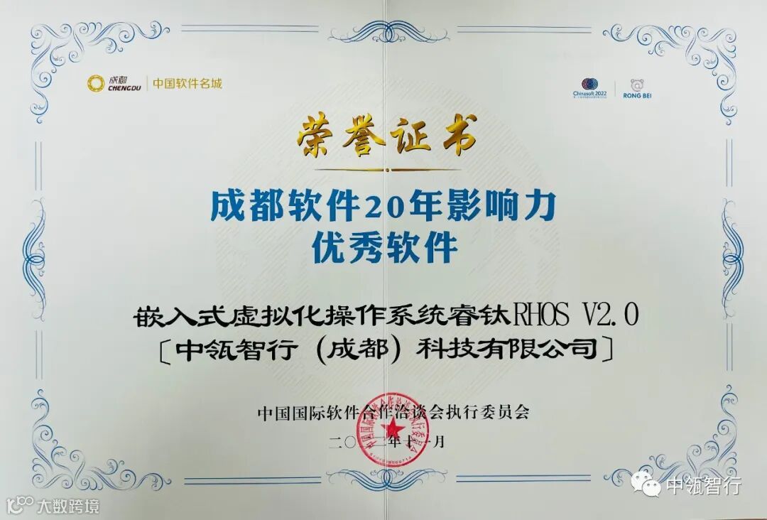 中瓴智行自主研发的嵌入式虚拟化操作系统睿钛RHOS V2.0获得“成都软件20年影响力优秀软件”。