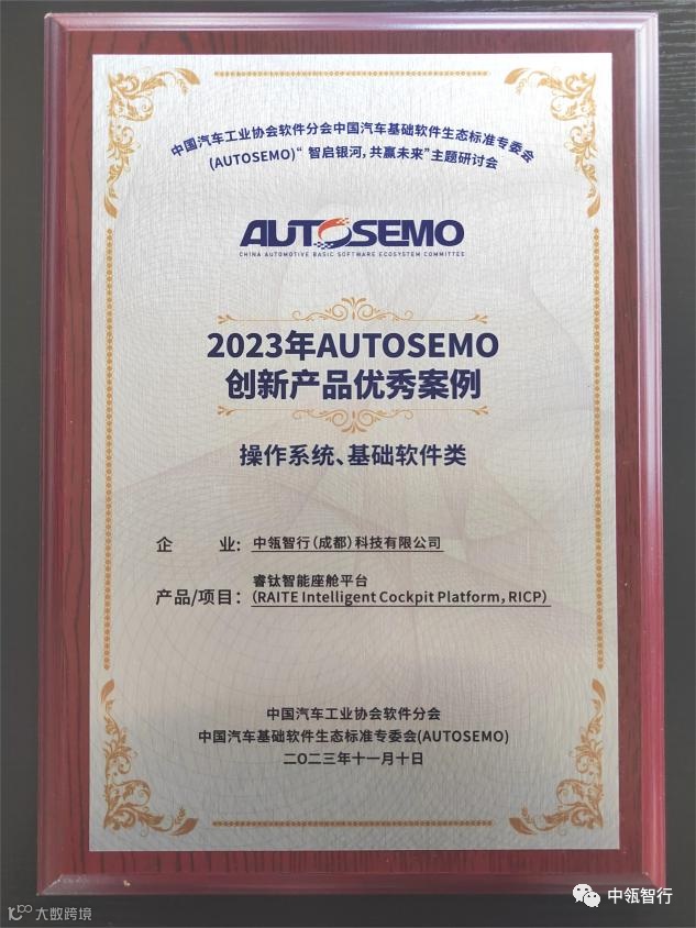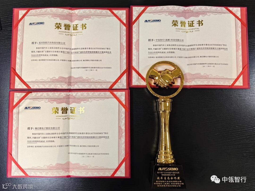 近日,中国汽车工业协会软件分会中国汽车基础软件生态标准专委会(以下简称“AUTOSEMO”)主办的主题研讨会在上海举行。2023年度AUTOSEMO奖项评选结果在活动现场揭晓,中瓴智行与合作伙伴协同荣获“2023年AUTOSEMO 技术生态合作奖”、“2023年AUTOSEMO创新产品优秀案例奖”及“2023年AUTOSEMO赋能精进奖”三项大奖。
