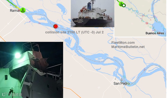 据外媒的报道称,当地时间7 月 2 日 2100 LT (UTC -3) 左右,散货船 “ARGENMAR MISTRAL”号在拉马洛下游巴拉那河 313 公里处与一艘杂货船 “ES VANQUISH”号发生相撞事故。