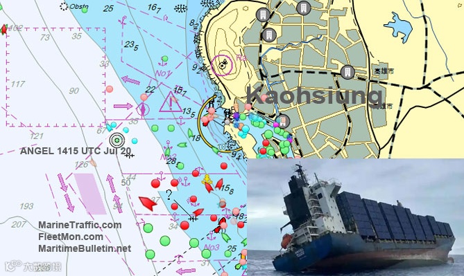 据悉,这艘帕劳籍集装箱船“天使”(Angel)号于7月4日下午8时46分申请于高雄港第二锚区西侧下锚暂泊待命,距离一港口南堤外约2.8海里处,7月20日上午9时31分高雄港务分公司接获该轮船通报,船体因不明原因进水,船体持续向左倾斜8至9度,船长宣布弃船。