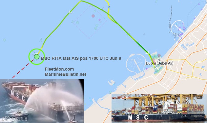 来自 MarineTraffic.com 的 AIS 数据显示,该船于该船于当地时间 6 月 4 日晚抵达迪拜,6 月 5 日早上离开迪拜,前往阿布扎比,当地时间 6 月 6 日抵达位于阿布扎比港的哈利法锚地。可能是在发现火灾情况后抛锚,根据最后的 AIS 位置数据,仍然处于抛锚的状态。该船自抛锚后未传输最新的数据。