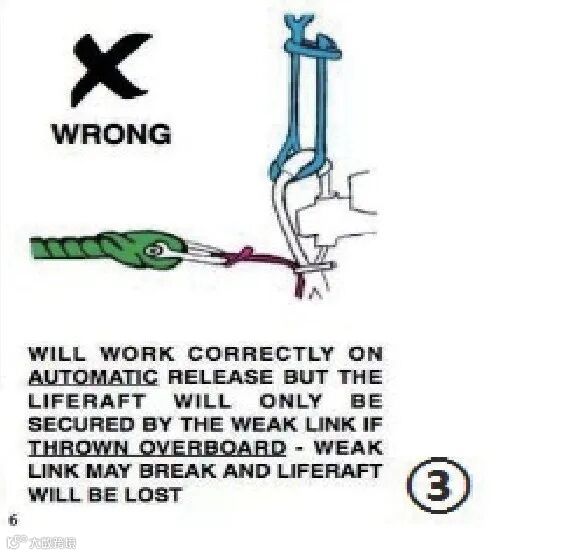 ③中,艏缆 (绿色) 通过卸扣与易断绳 (红色) 相连接,但并没有连接到静水压力释放器,这种连接方式在救生筏自动脱钩时能正常工作,但当需要手动脱钩时,由于救生筏的艏缆仅通过易断绳与船体连接,在救生筏被手动释放时可能由于易断绳的断裂导致救生筏漂走丢失。