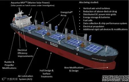 Aquarius Eco Handymax II设计包括集成的风帆辅助推进与太阳能系统,以及各种系列能源节约装置,包括一套空气润滑系统(ALS)和电力推进与燃料电池。