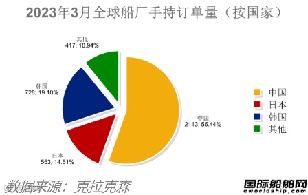 克拉克森数据显示,截至2023年4月8日全球船厂手持订单3,811艘,共计110,588,200CGT。和2023年3月9日统计的3,852艘,合计110,242,414CGT相比,手持订单数量环比下跌1.06%,修正总吨环比上升0.31%。