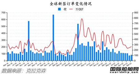 根据克拉克森最新数据统计(截至2023年4月8日),2023年3月份全球新签订单84艘,共计2,647,533CGT。与2023年2月份全球新签订单75艘,共计2,453,124CGT相比较,数量环比增加9艘,修正总吨环比上升7.92%。与2022年3月份全球新签订单194艘,共计4807077CGT相比较,数量同比减少110艘,修正总吨同比下降44.92%。