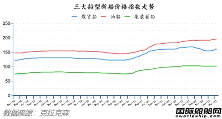 克拉克森数据显示,3月份集装箱船新船价格指数环比持平,为102点;散货船、油船新船价格指数环比分别上升4点、1点至161点、196点。