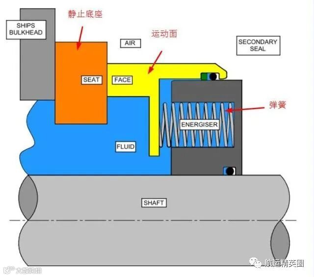 端面密封里面有动环、静环,由耐磨材料制成。动环随尾轴一起转动,在流体压力和弹簧弹力作用下,动环与静环紧密的贴合在一起,再配合辅助密封,就将海水封闭在船舱之外了。