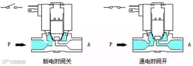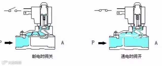 常闭型通电时,电磁线圈产生电磁力把敞开件从阀座上提起,阀门打开;断电时,电磁力消失,弹簧把敞开件压在阀座上,阀门敞开。(常开型与此相反)