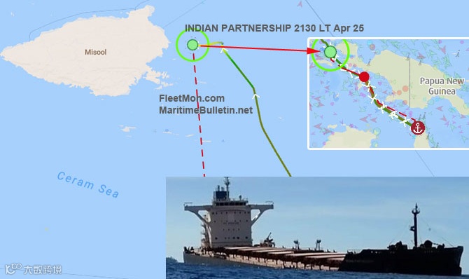 据外媒的报道显示,一艘装载铝土矿的好望角型散货船“INDIAN PARTNERSHIP ”号在印度尼西亚赛兰海拉贾安帕群岛的米苏尔岛附近海域发生搁浅事故。