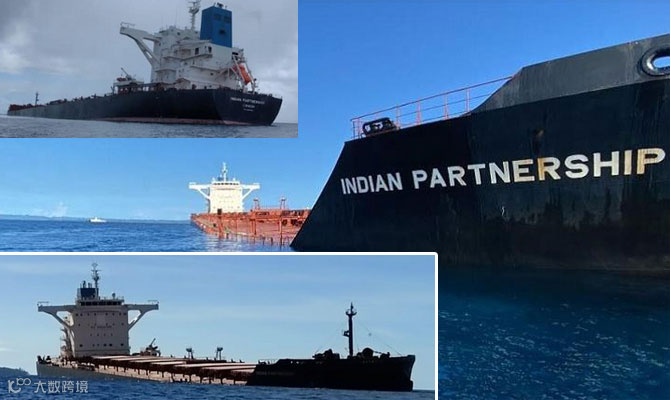 从现场发来的照片显示,散货船“INDIAN PARTNERSHIP ”号部分船体已沉入水中。据悉,该船水下船体的前部区域发生破裂,导致船体大量进水。