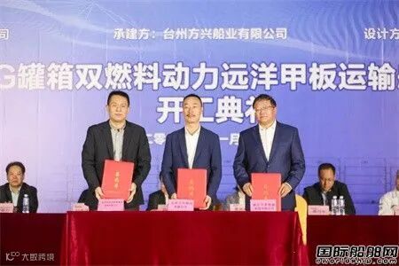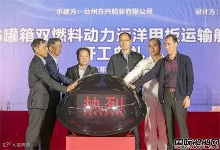 11月22日上午10:08,台州方兴船业有限公司举行715箱LNG罐箱双燃料动力远洋甲板运输船开工仪式。