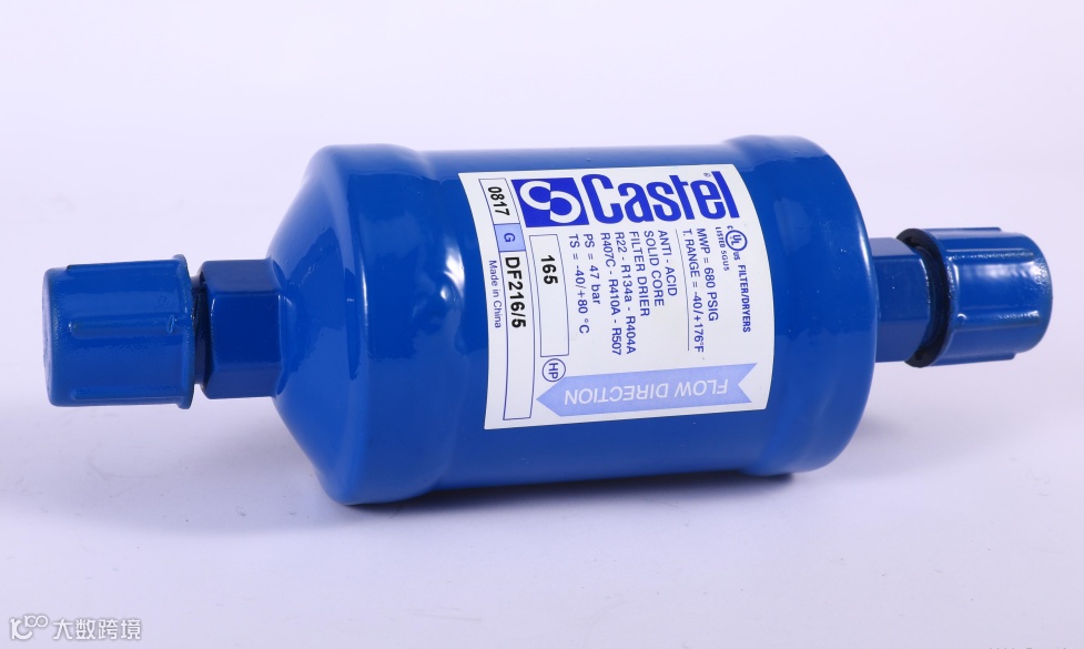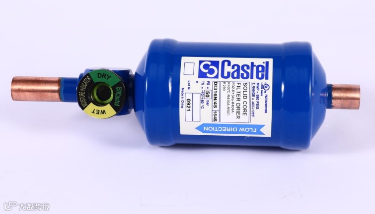 当然,也可以选择一些带视液镜功能的干燥过滤器,如下图所示,Castel(卡士妥)干燥滤器有带视液镜,这种就省去了额外在安装视液镜工序。