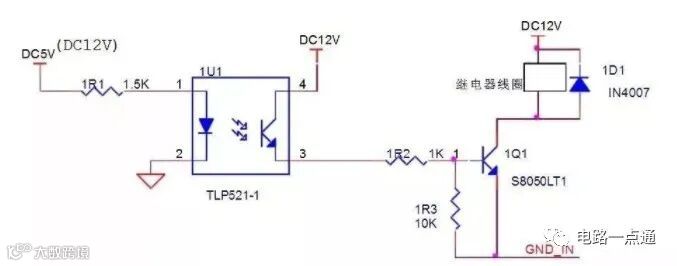 当输入高电平时,晶体管T1饱和导通,继电器线圈通电,触点吸合。