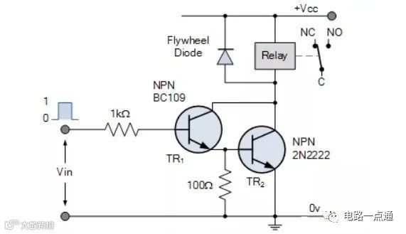 如果将两个单独的晶体管配置为达林顿开关对,则通常在主开关晶体管TR2的基极和发射极之间放置一个小电阻(100至1,000Ω),以确保其完全截止。同样,使用续流二极管保护TR2免受继电器线圈断电时产生的反电动势的影响。