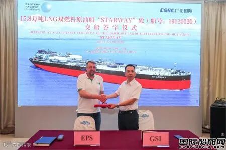 9月2日,由中国船舶集团旗下广船国际为新加坡EPS公司建造的15.8万吨LNG双燃料油船2号船“STARWAY”号签字交付,标志着全球首个、华南最大LNG双燃料动力苏伊士型油船项目圆满收官。
