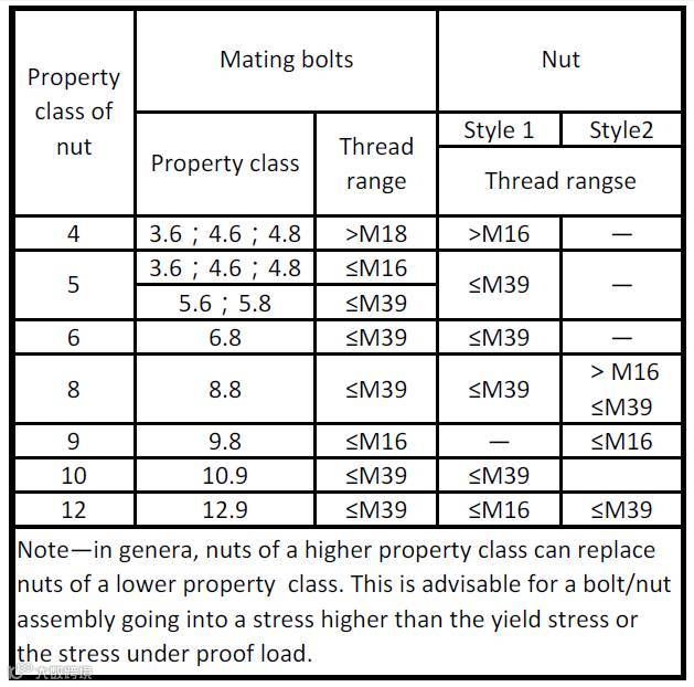 按照ISO898要求,与螺栓配合的螺纹副/螺母强度要与螺栓本身强度相匹配,比如螺栓强度为10.9的螺栓,应采用强度为10的螺母。