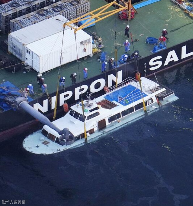 观光船沉没事故发生在4月23日。迄今已经确认14名乘客死亡,10名乘客和2名船员下落不明。事故发生1个月后的5月23日,日本Salvage将该船从水深120米的发现地点起吊至水深20米处,但在拖行时固定船体的吊索脱落,致使船体再次沉入海底。