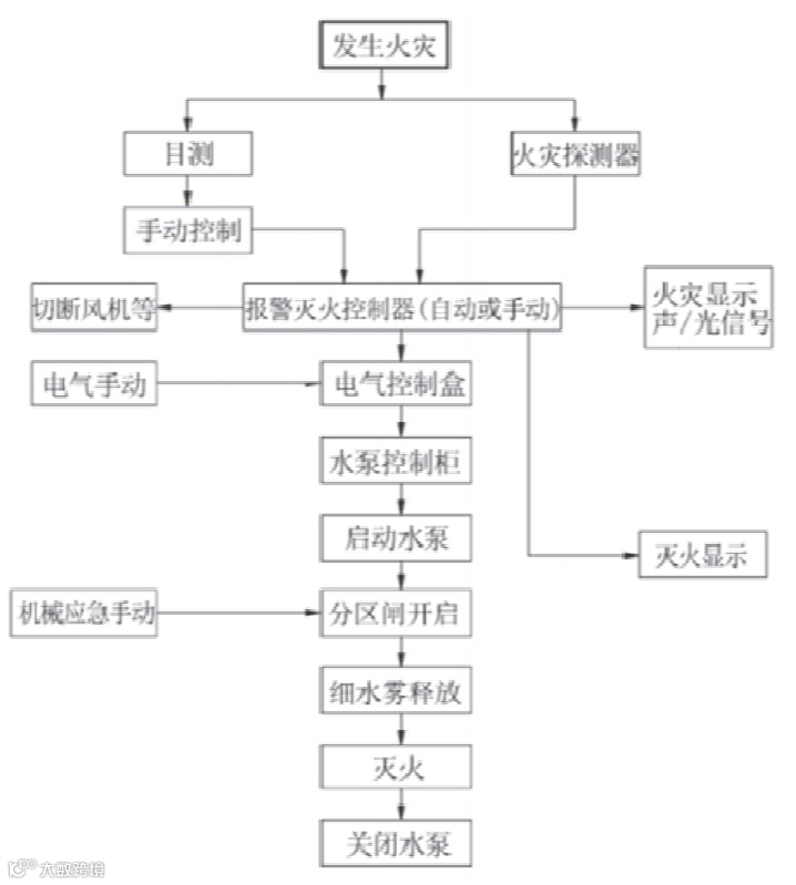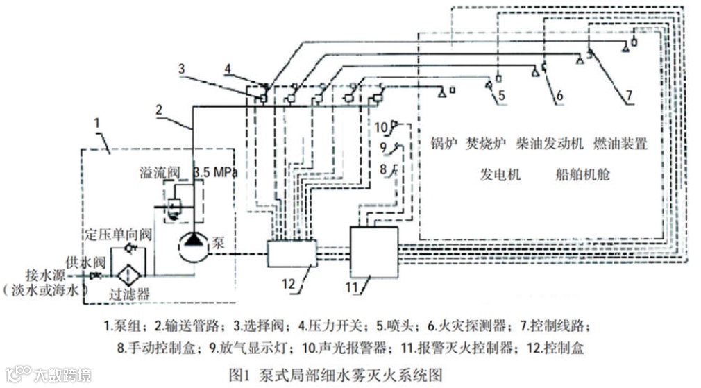 目前,船上的固定式局部水基灭火系统基本采用细水雾灭火系统,该系统采用淡水作为灭火介质,具有环保、易于存储、灭火效果良好、对设备破坏性小等特点。以最常见的泵式局部细水雾灭火系统为例,系统主要由泵组、控制箱、选择阀、管系、探测警报、喷头等组成,如图所示。