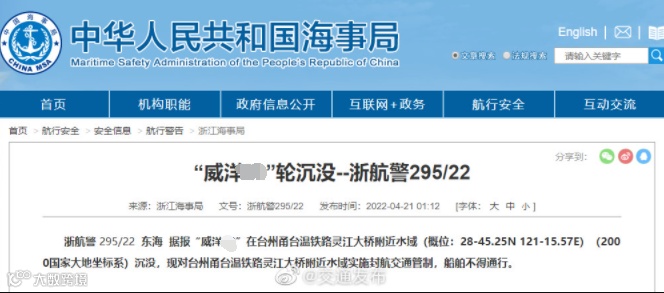 4月21日,浙江海事局发布消息,“威洋X8”轮在台州甬台温铁路灵江大桥水域沉没,已对台州甬台温铁路灵江大桥实施封航交通管制,善后处置正在进行中。上铁宁波车务段微博表示,经监测评估,该次撞击不涉及桥墩安全,杭深高铁在该段运行不受影响。铁路部门将会同相关部门对事件作进一步调查。