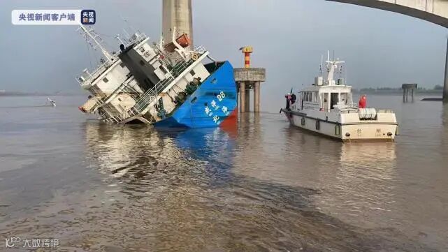 事发位置北岸是一处造船厂,南岸是一个装卸码头,被撞桥墩位于江心位置,一艘货船侧翻,半截露在水面上。