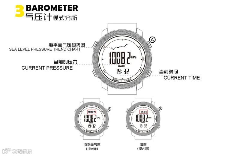 可测出海平面高度,可同时显示温度