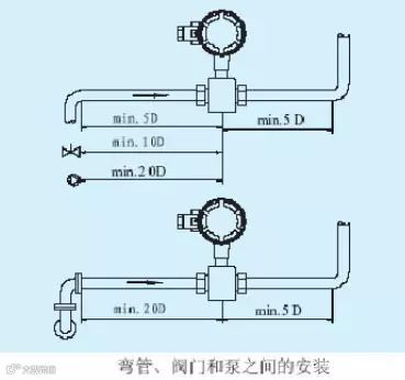 入口直管段管道应大于5D,出口直管段管道应大于2D。有具体安装要求的应根据电磁流量计说明书进行安装。 插入式进口直管段应≥ 20 D , 出口直管段≥7D(D为传感器公称口径)。