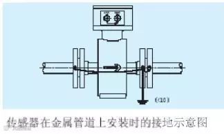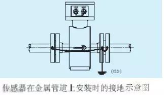 传感器在金属管道上安装(金属管道内壁没有绝缘涂层),按下图接地。