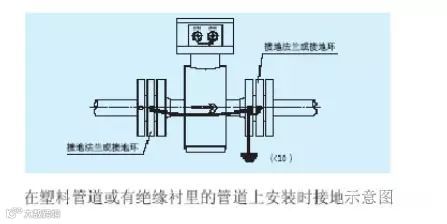 传感器在塑料管道上或在有绝缘衬里的管道上安装,传感器的两端应安装接地环、或接地法兰、或带有接地电极的短管,按下图接地。