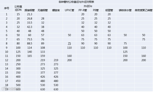 公称直径可用公制mm表示,也可用英制in表示。管路附件也用公称直径表示,意义同有缝管。它与英制单位的对应关系如下: