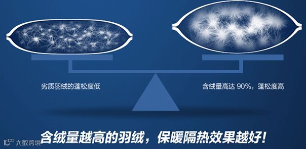 鹅绒的绒朵普遍比鸭绒绒朵大,蓬松度比鸭绒高出50%