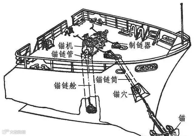 我个人认为,冲洗锚链用的水,不光能冲洗锚链,还有冷却和润滑的作用。我们看下图,可以看出,在收锚的过程中,锚链和锚唇是在摩擦运动的,本身锚链和锚的重量很大,那么锚链和锚唇的摩擦力也很大,这时冲洗锚链的水流过它们的摩擦接触位置就能起到很好的冷却和润滑作用了。