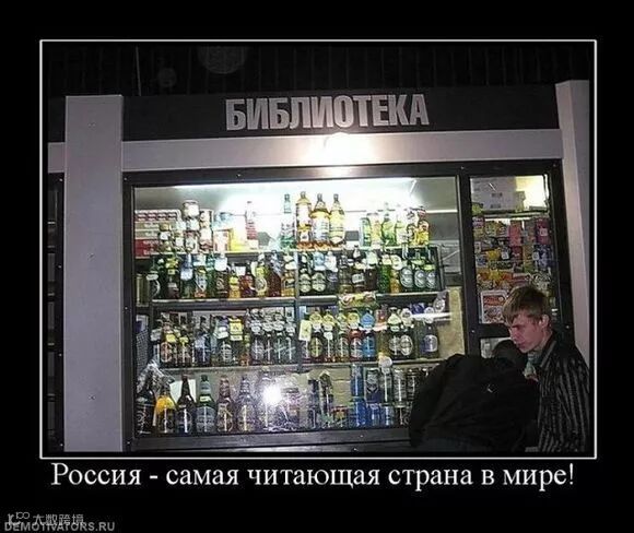 呵呵,看来副业经营的不错呀!(图中俄文为图书店,讽刺俄罗斯国内许多图书店里售卖的酒类比书还多)