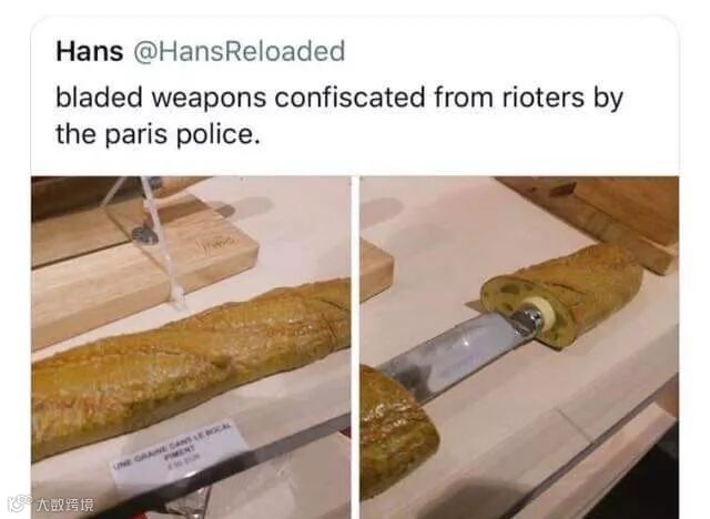 ▲巴黎市警察从暴乱者那儿没收的武器