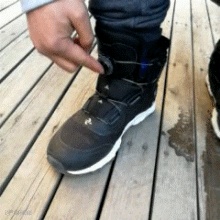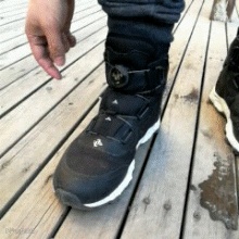 一根手指轻轻按着BOA螺旋,听到啪的一声,转动螺旋,带丝随之绑紧调节到脚舒适的松紧,就OK了。