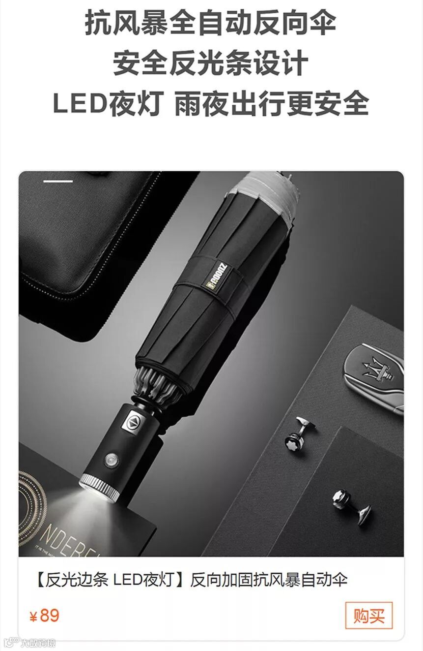 风暴全自动反向伞,使用了安全反光条设计,还自带LED夜灯,让你雨夜出行更安全。