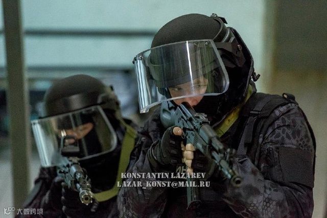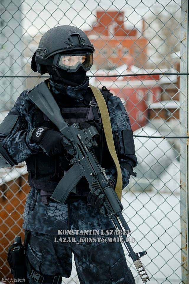 组图中,特种部队士兵身穿蟒纹迷彩作战服,头盔与防爆眼镜的组合让士兵们显得战斗力十足,AK-74突击步枪在他们的随时准备喷吐出制裁的火花。